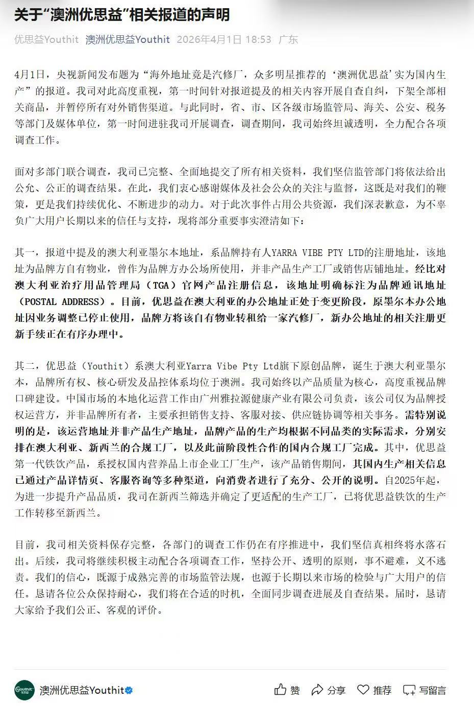 该品牌仍强调,优思益(Youthit)系澳大利亚Yarra Vibe Pty Ltd旗下原创品牌,诞生于澳大利亚墨尔本,品牌所有权、核心研发及品控体系均位于澳洲。“目前,我司相关资料保存完整,各部门的调查工作仍在有序推进中,我们坚信真相终将水落石出。”